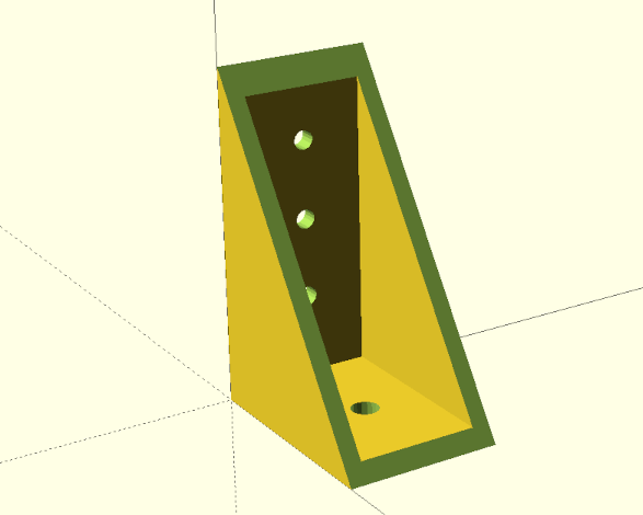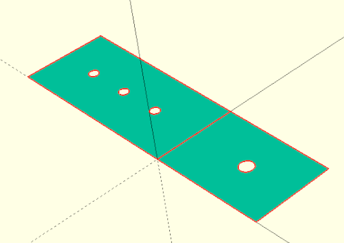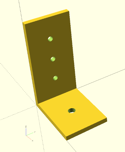 Nehmen wir einmal an, wir haben unseren Regalbodenwinkel mit einem 3D-Drucker hergestellt und wollen ihn nun an der Wand montieren. Wäre es nicht praktisch, wenn wir jetzt eine Bohrschablone zum ausdrucken hätten? Zu diesem Zweck können wir eine 3D zu 2D Projektion nutzen, die in OpenSCAD über die Projektionstransformation (engl. projection) zur Verfügung steht: