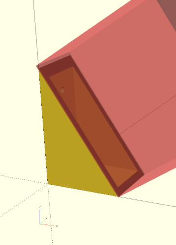 Nachdem wir unseren Quader rotiert haben, müssen wir ihn nur noch an die richtige Position schieben. Dies geschieht mit der Verschiebe-Transformation (translate). Wie erwartet verschieben wir unseren Quader um die Länge der Seite A entlang der X-Achse. Die Verschiebung um -1 entlang der Y-Achse dient der Absicherung der Differenzoperation und korrespondiert zu der Zugabe um 2 Millimeter in der Breite. Um die Zugabe in der Höhe brauchen wir uns an dieser Stelle nicht zu kümmern, da es reicht, wenn der Quader unseren Winkel in Kipprichtung überragt.