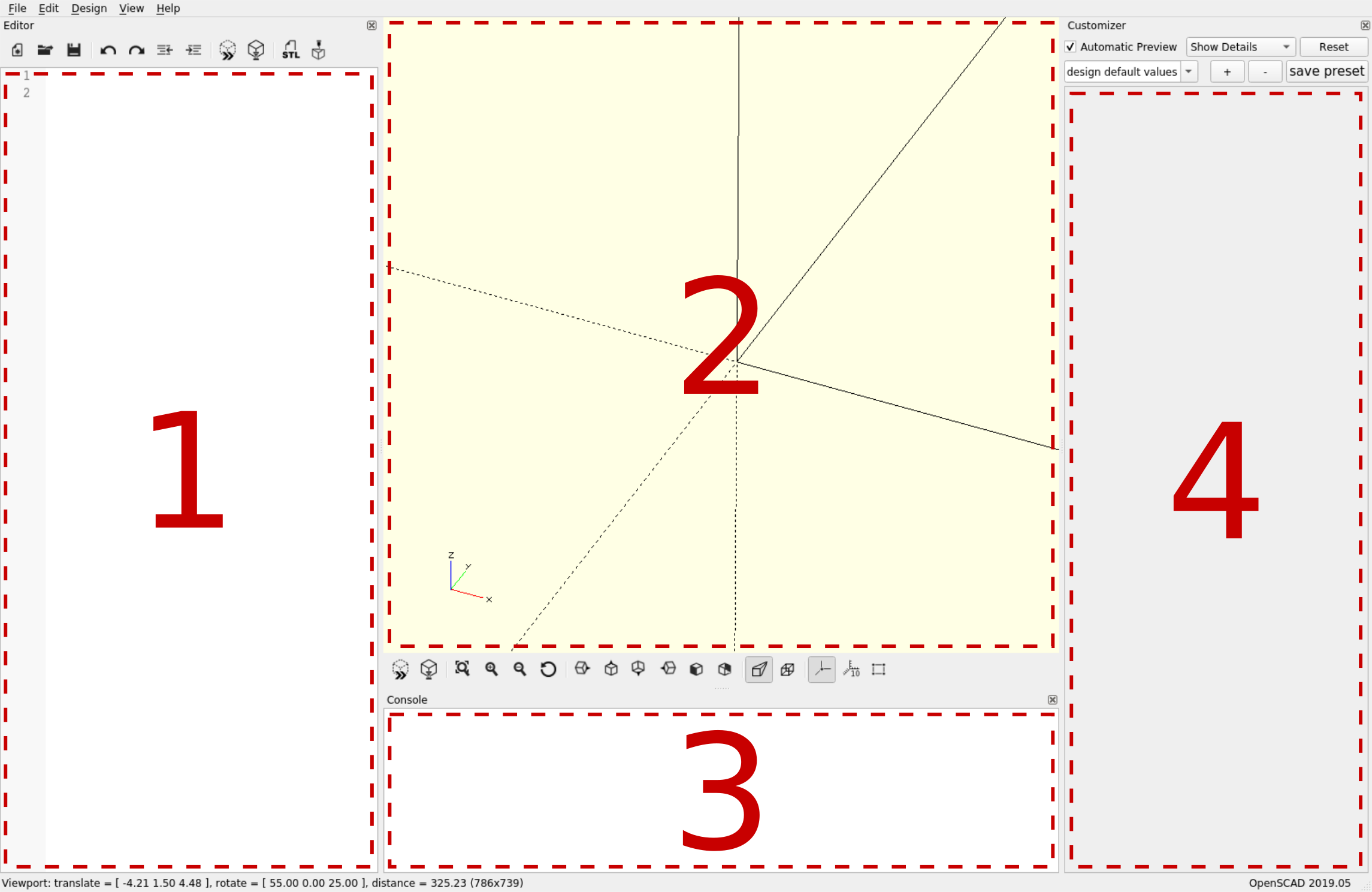 Für’s erste starten wir OpenSCAD mit einer neuen, leeren Datei (Schaltfläche New) und schauen uns die Bedienoberfläche des Programms einmal an.