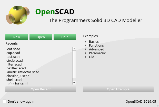 Nach dem Start von OpenSCAD wird man von einem kleinen Startfenster begrüßt (Abbildung 1.). Die Schaltfläche New (dt. Neu) startet das Programm mit einer leeren, noch nicht abgespeicherten Datei. Mit der Schaltfläche Open (dt. Öffnen) gelangt man zu einem Dateiauswahldialog, über den man eine bereits existierende Datei auswählen und laden kann. OpenSCAD-Dateien enden auf die Dateiendung .scad. Es handelt sich hierbei um einfache Textdateien. Die Schaltfläche Help (dt. Hilfe) öffnet einen Internetbrowser mit der Online-Hilfe des Programms. Unterhalb dieser drei Schaltflächen gibt es zwei Listen. Die Liste auf der linken Seite zeigt die zuletzt mit OpenSCAD bearbeiteten Dateien an. Wählt man eine dieser Dateien aus, wird die Schaltfläche Open Recent (recent » kürzlich) unterhalb der Liste aktiv und mit einem Klick auf diese Schaltfläche wird dann die entsprechende Datei geöffnet. Dies ist leider wenig intuitiv, da man schnell dabei ist, nach der Auswahl einfach auf die Schaltfläche Open oberhalb der Liste zu klicken (was nicht zum gewünschten Ergebnis führt). Die Liste auf der rechten Seite offeriert eine Reihe von thematisch sortierten Beispielen. Vor jedem Thema wird ein kleines Dreieck angezeigt. Ein Klick auf das Dreieck “klappt” das Thema auf und man kann eine der Beispieldateien auswählen. Dies aktiviert die Schaltfläche Open Example (example » Beispiel) unterhalb der Liste, mit der man das ausgewählte Beispiel öffnen kann. Alternativ kann man in beiden Listen eine ausgewählte Datei auch dadurch öffnen, dass man sie doppelklickt. Möchte man nicht bei jedem Start von OpenSCAD von diesem Startfenster begrüßt werden, kann man dies durch Ankreuzen des Auswahlfeldes Don’t show again (dt. Nicht erneut anzeigen) unten links erreichen.